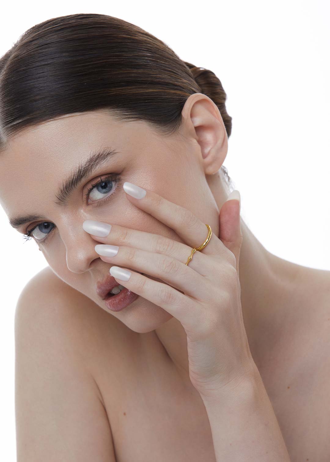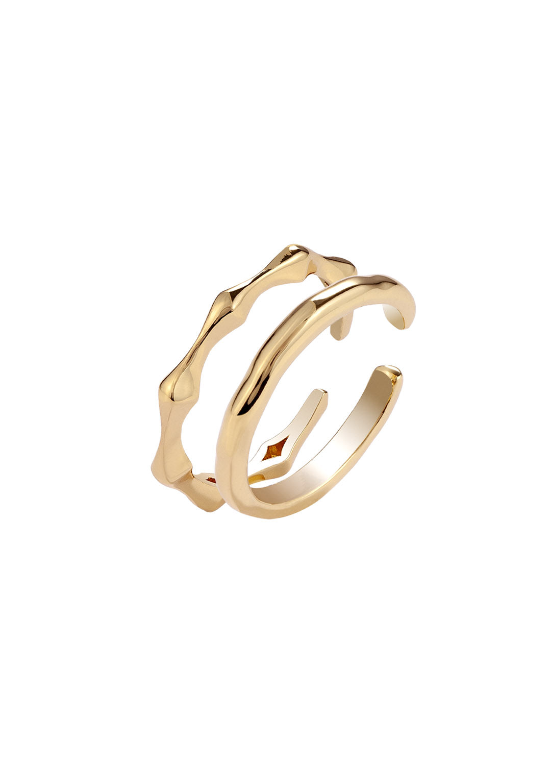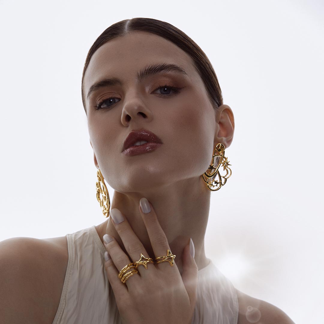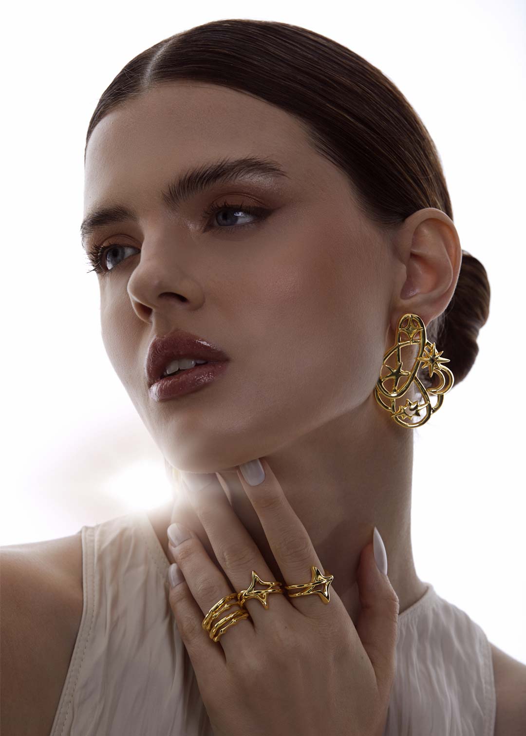 A Aliança Dupla Estrela Lúmen é delicada e atemporal: um par composto por uma aliança fina orgânica e outra com mini estrelas em sequência, criando um brilho sutil e contínuo.