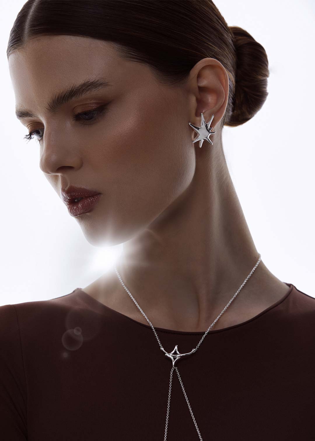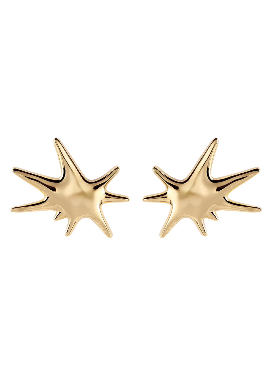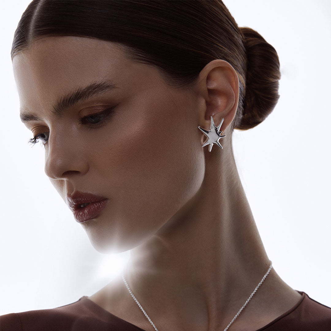 Brinco médio com design de estrela orgânica e abstrata, que traduz a essência da coleção Lúmen ao unir brilho e formas inspiradas no universo.