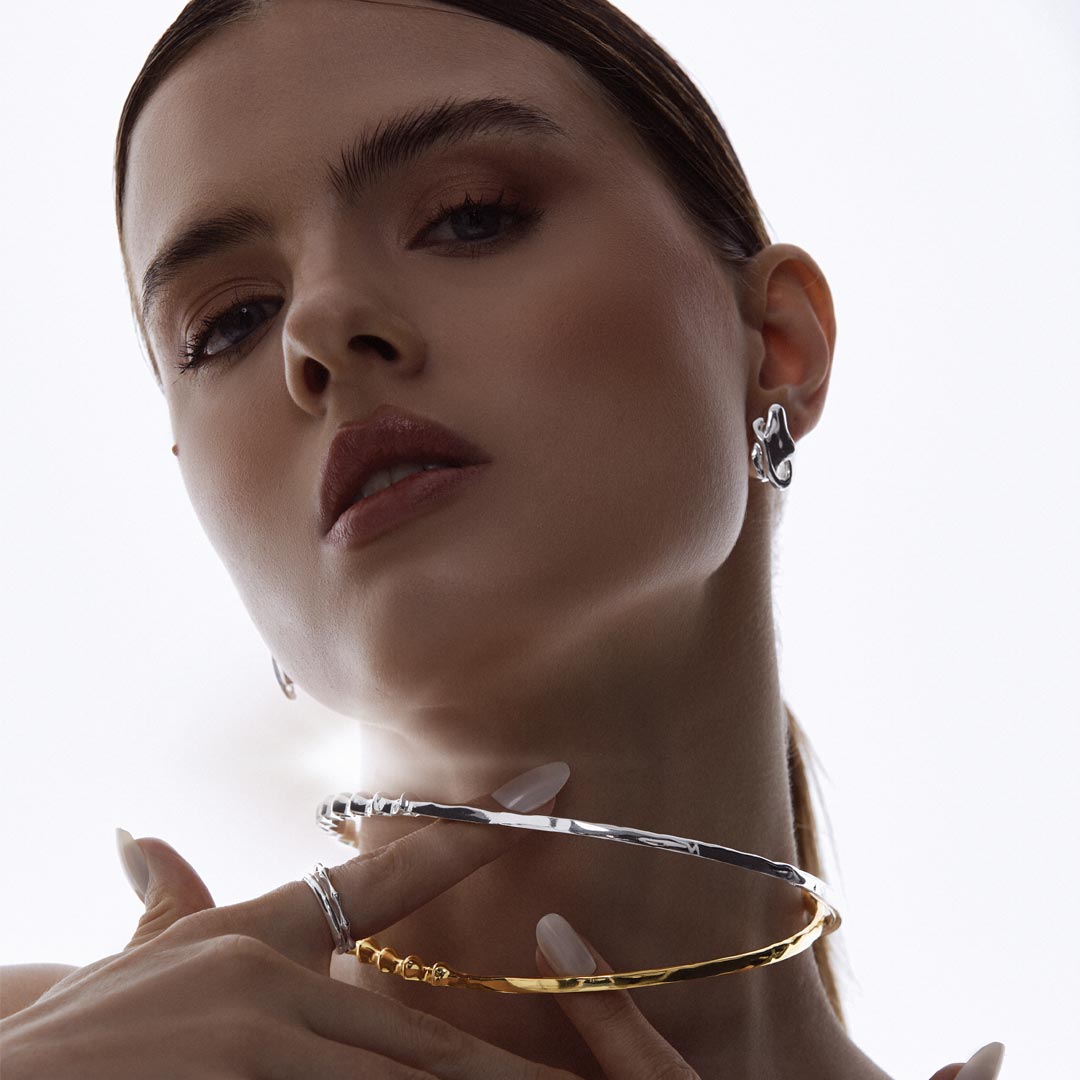 Leve e minimalista, o Colar Choker Aro Estrela Lúmen é um aro rígido e fino que combina metade orgânica com uma sequência de pequenas estrelas, formando uma constelação ao redor do pescoço.