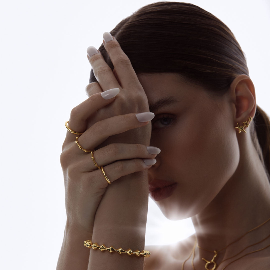 Brinco estilo earcuff que “sobe” delicadamente pela orelha, com três estrelas orgânicas e diferentes entre si, criando um brilho em movimento.