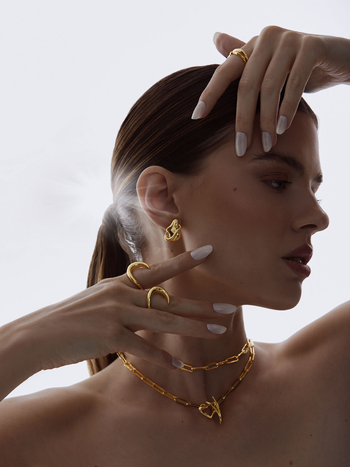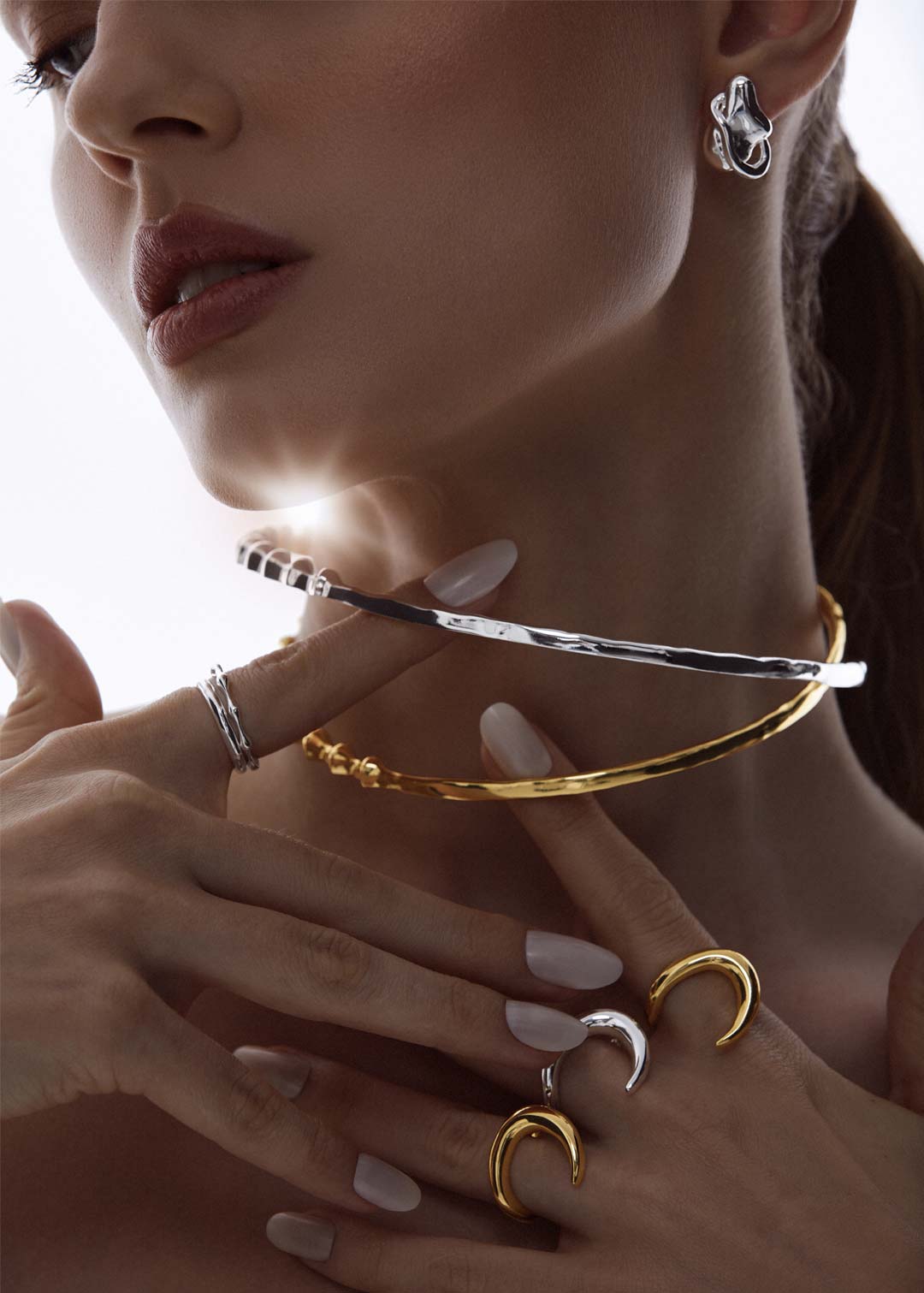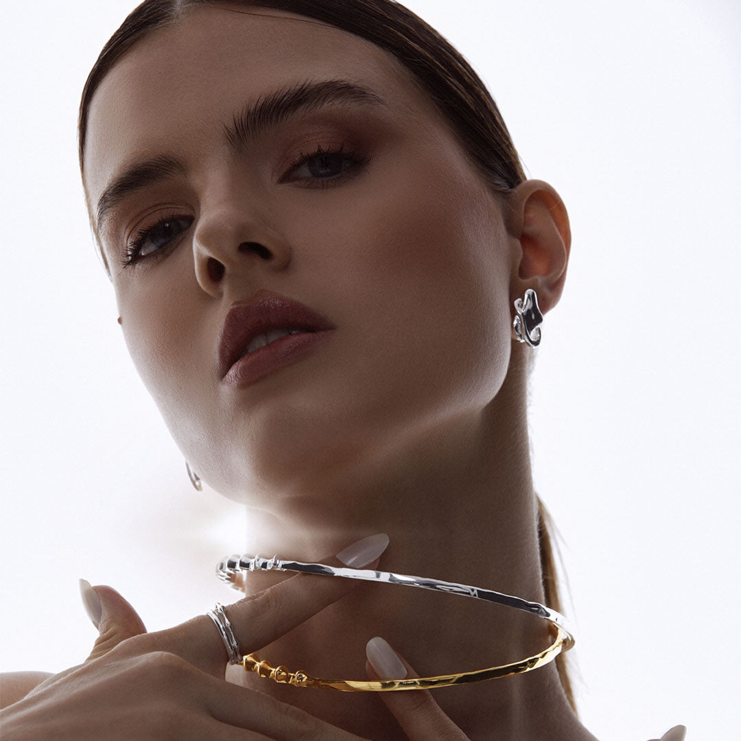 Brinco pequeno de design orgânico, inspirado na órbita de um planeta, criando um ponto de luz delicado para o dia a dia.