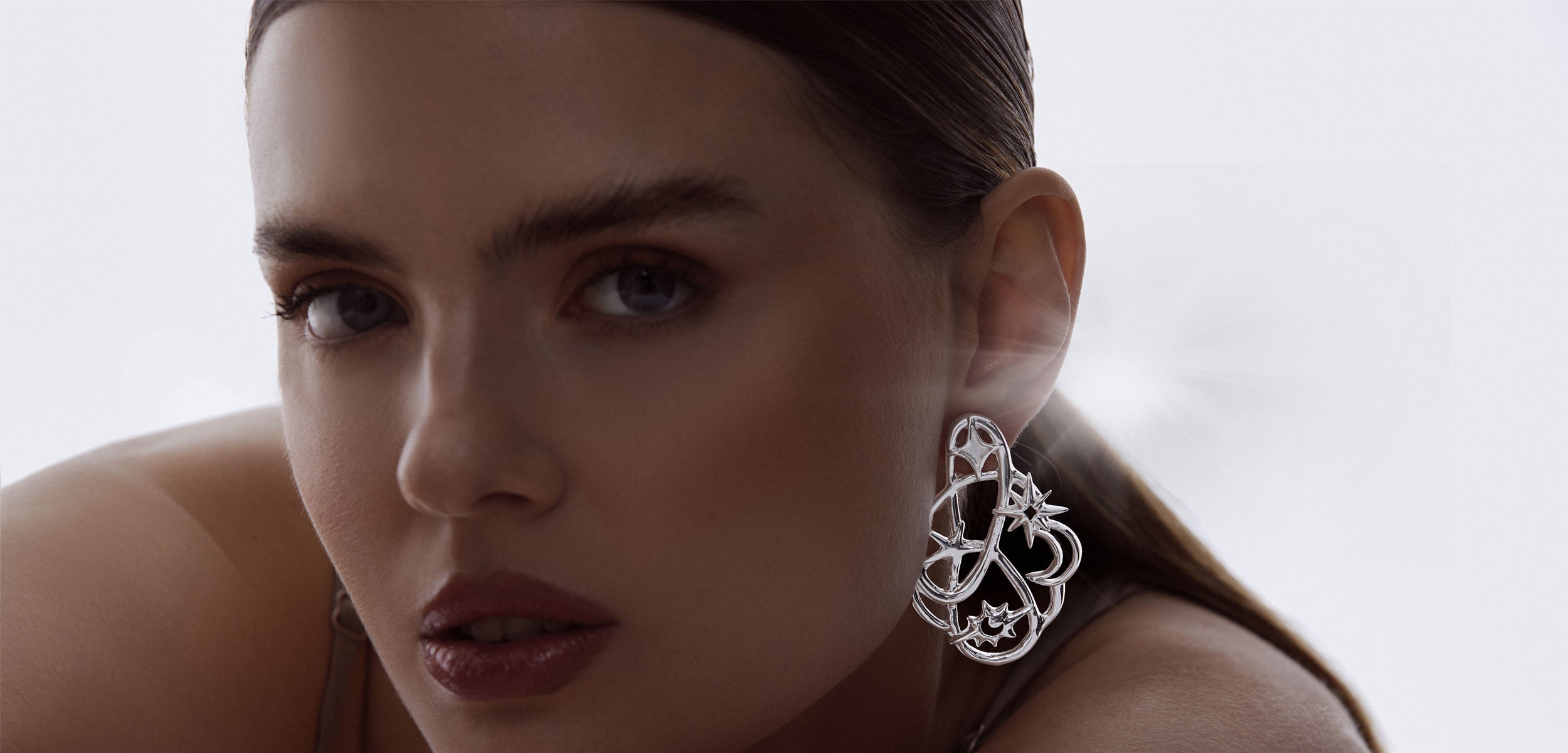 Brinco pequeno de design orgânico, inspirado na órbita de um planeta, criando um ponto de