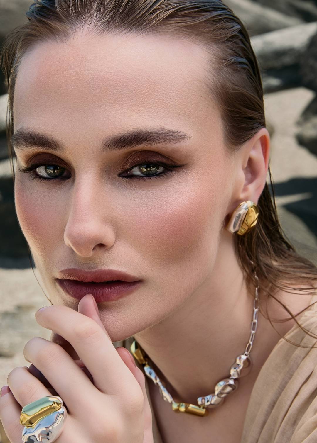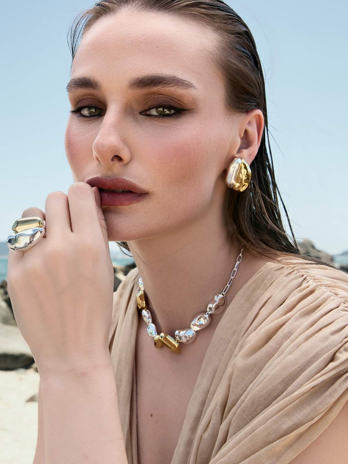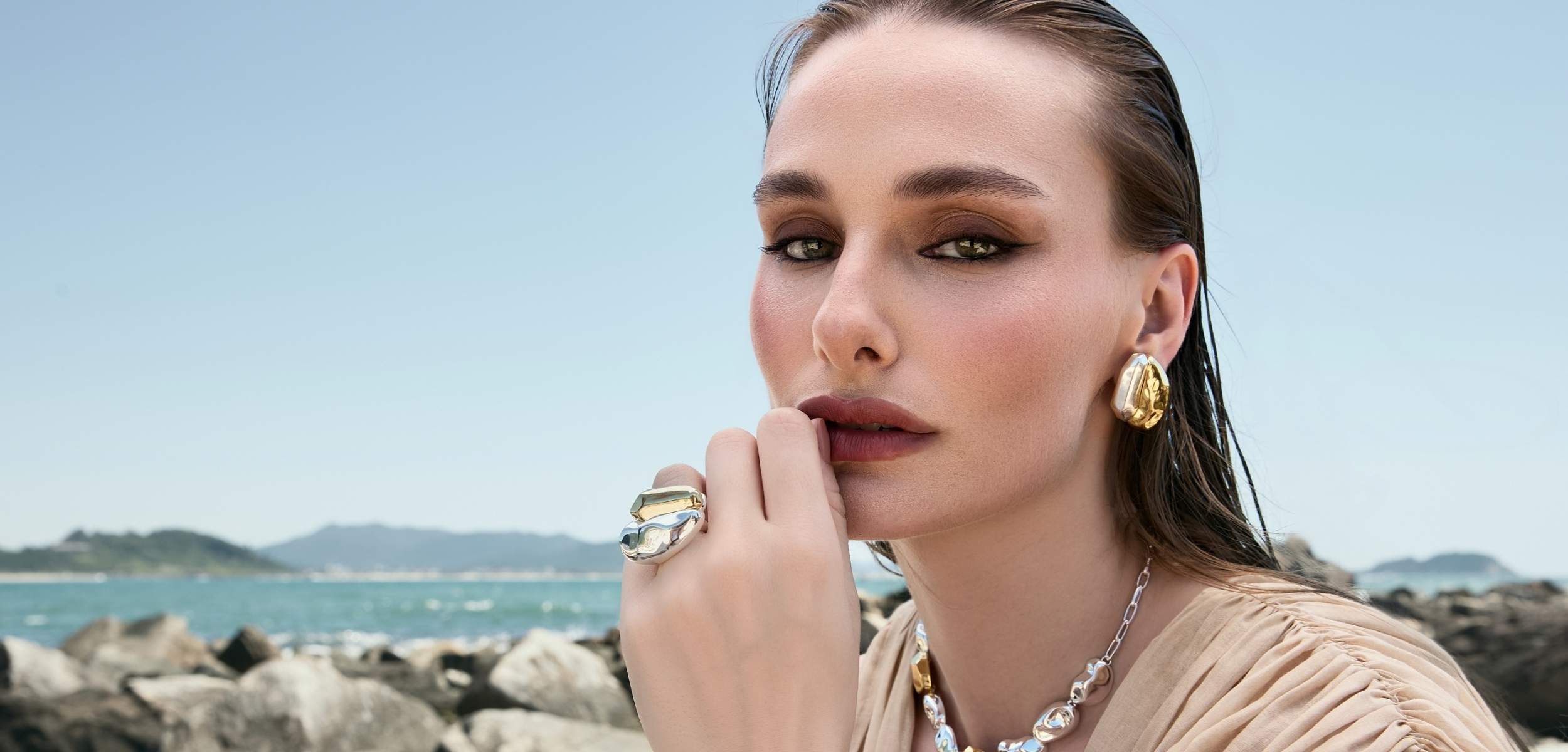 coleção em uma composição de forma abaulada e volume polido, combinados à pedra de